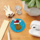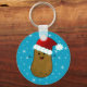 Feliz Navidad patata, con un sombrero rojo brillante de Santa. Fondo azul cubierto de copos de nieve blancos brillantes.