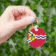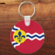 Button Keychain with flag of city of St. Louis; red flag with white and blue waves and blue fleur-de-lys in yellow circle