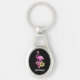 Esta cadena de claves metalizado personalizada tiene un fondo negro con un flamingo rosa lindo y flores hibicus tropicales.