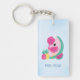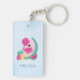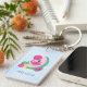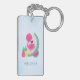 El keychain acrílico personalizado es un lindo ilustracion de un flamingo rosa con algunas sandías y piñas. Color rosa y verde. Summery y tropical. Fondo azul claro.