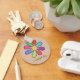 Flor gráfica con 8 pétalos de colores variados y centro amarillo. Texto "un día colorido". El fondo se puede personalizar.