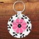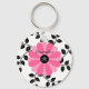 Una cadena monocálgica y de moda con una flor de margarita rosa y negro y hojas de estampado de corona. Personalice esta moda y el anillo de claves elegante añadiendo su nombre y sus iniciales monogramadas.