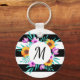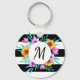 cadena de teclas del botón de bonito con color de agua floral sobre fondo rayado blanco y negro. Personalizar el monograma eligiendo entre muchas fuentes maravillosas.
