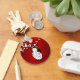 Una linda muñeca kokeshi con un kimono blanco con mariposas rojas. Con una rama blanca de flores de cerezo y un fondo rojo rubí. Adorable diseño de estilo chibi japonés.