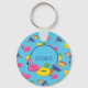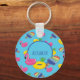 Crea un regalo personalizado único que es perfecto para tu nadador favorito. Este llavero presenta un patrón de flotadores de piscina de colores vivos o de tubos de billar en forma de flamingo, piña y pájaros con un fondo azul brillante. Utilice el campo de plantilla para agregar fácilmente su nombre a esta cadena de claves temática del fiesta de grupo.