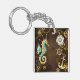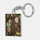 Fondo de madera marrón con mar, cresta mecánica, volante antiguo, ancla dorada y varios engranajes de oro y latón. Estilo Steampunk.