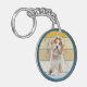 Este llavero muestra un retrato de un adorable pequeño perro chiíta, blanco y marrón. La imagen está colocada sobre un fondo retro, ligeramente afligido, de rayas de color dorado y azul retro. La parte posterior tiene un fondo azul sólido con el texto en dos campos.