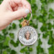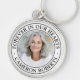 Keychain featuring a photo and custom text "forever in our hearts" and name in an elegant serif font on a white background.