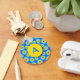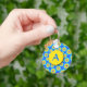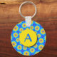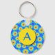 Personalice esta cadena de claves con su inicial. El diseño tiene una imagen de arte fractal con flores de estilo margarita azul y amarillo y una inicial azul en el centro sobre un punto amarillo.