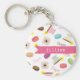 A keychain featuring illustrations of teacups, French anemone flowers, French macarons, and "bonjour!" Personalize with your name.