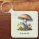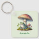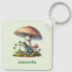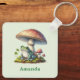 A keychain with a cool illustration. Featuring a green frog sitting on a mound of grass. A big red mushroom sheltering him from the elements. A couple of little toadstools nearby.