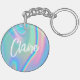 Esta divertida y moderna cadena de teclas cuenta con un falso fondo iridiscente en divertidos tonos rosa, violeta y azul. Encima de la imagen de fondo está tu nombre en la escritura moderna de caligrafía blanca. El diseño es el mismo en ambos lados. ¡Hace un regalo fabuloso para cualquiera!