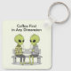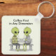 Add a cosmic boost to your day with this fun alien coffee keychain. Featuring two aliens relaxing with their coffee mugs, this playful design celebrates the universal truth that coffee comes first—no matter the planet. The phrase “Coffee First in Any Dimension” adds a sci-fi twist that’s perfect for coffee lovers, space enthusiasts, and anyone who can’t function before their first cup.