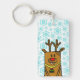 Funny Deer Blue Snowflake Pattern Winter Holidays Keychain. Cervezas y ciervos graciosos con una nariz roja sobre un fondo con un patrón de copo de nieve azul.