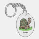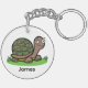 Divertida, peculiar, tortuga personalizado, cadena de claves personalizada. Esta linda tortuga tiene una expresión cómica tonta en su cara, una concha verde y un cuerpo marrón. Las palabras "James" con letras negras están debajo de la tortuga, esta es una plantilla para añadir tu propio nombre a personalizar.