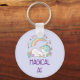 Un llavero con un diseño bonito y divertido. Un uncorn blanco con una manga y una cola de colores pastel y tres pequeñas estrellas en la espalda. Un arcoiris colorido sobre el cielo. Rodeada de una corona circular compuesta de nubes, corazones y flores para un toque más jovial. El texto dice AF mágico. Humorístico y adorable.
