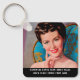 Kitschy, divertido y un poco sarcástico keychain tiene una mujer casera vintage de los años 50 con "La felicidad viene de la paz interior. La paz interior proviene del vino".