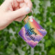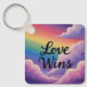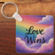 Este llavero presenta una caprichosa impresión de pintura al óleo de un soñador paisaje de nubes de arcoíris con el mensaje de recordatorio de que el Amor Gana en una delicada escritura cursiva.