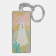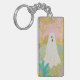 A whimsical and surreal painting featuring a classic, cartoon-like ghost figure—a white sheet with black holes for eyes and an open mouth—centered in a lush, stylized garden or forest setting. The background is dominated by gold leaf and broad, expressive strokes of light pink and gold suggesting trees. The foreground is a dense array of abstract foliage and bushes painted in thick, vibrant colors including lavender, bright green, teal, and blue. The overall aesthetic is naive, dreamlike, and uses a striking combination of flat, folk-art elements and rich, textural embellishment.