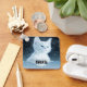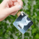 Un llavero con una adorable fotografía de un gatito blanco de pelo corto con ojos azul brillante. Mirando hacia la distancia. Las patas se cruzan a la manera típica de gatos gatitos.