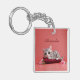Un lindo gato de tabby, personalizado gris y blanco, se coloca sobre una almohada de color granate con claveles rosas cerca.