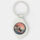 Atardecer Wave-Riding Cat keychain: Un gato negro surfeando sobre una ola, con el sol en tonos rosados y naranjas, creando una escena caprichosa y surrealista.