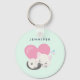 Cadena de teclas personalizada con un adorable ilustracion gráfico. Un gato blanco gatito con una linda imagen impresa en su piel. Dormir pacíficamente. Un gran corazón rosado detrás de ella y algunas pequeñas estrellas también. Fondo verde suave.