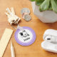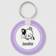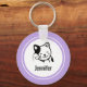 Un keychain personalizado diseñado con el ilustracion de un gatito sonriente y ondeando con un manto negro alrededor de su oído. Fondo del punto de polka morado. Simple lindo y adorable.