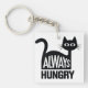 Gato negro estilizado con características exageradas, incluyendo ojos grandes y orejas puntiagudas. El cuerpo del gato tiene una forma abstracta y curva, y está posicionado de manera que sugiere que es juguetón o curioso. Debajo del gato, las palabras "SIEMPRE HAMBRIENTO" se muestran de manera prominente en letras blancas y negritas. El diseño general es simple pero llamativo, combinando una representación caprichosa de un gato con un mensaje humorístico sobre su apetito. El fondo es blanco liso, enfatizando la silueta negra del gato y el texto.