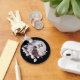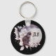 Una cadena de llaves con una pintura acuarela de un gato negro y un ramo floral rosa y violeta. Frente a una gran luna llena. Elegante y mágico.