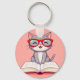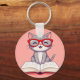 Gato personalizado alegre con gafas rojas, sentado en un libro abierto sobre un fondo rosado.