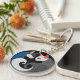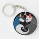 Representación artística de dos gatos enfrentados, entrelazados en un diseño circular. Los gatos están representados en colores contrastantes negro y blanco, con vibrantes acentos rojos en sus orejas y ojos. El fondo presenta un gradiente de azul y negro, lo que mejora el contraste visual general y la simetría de la composición.