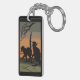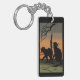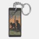 Esta imagen retrata a 2 gatos negros con ojos brillantes sobre un parche de hierba bajo una rama de un árbol muerto. El cielo en la parte de atrás es un naranja, y el color negro claro. Se agregó un borde negro. Estas cadenas clave están disponibles en diversos estilos y tamaños.