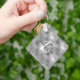 This elegant personalized keychain features a monogram and first name in modern charcoal gray and white script on a glam silver faux glitter and foil background.