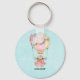 Una cadena de llaves con un diseño adorable con un ilustracion acuarela. Un globo de aire caliente decorado con flores rojas y rosas bonitos. Un lindo oso bebé blanco se sienta en la canasta. Fondo azul claro.