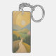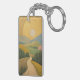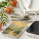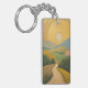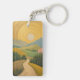 This serene landscape painting depicts a winding path leading through a lush, verdant valley toward distant, rolling mountains. The most striking element is a magnificent, radiant sun that dominates the upper half of the canvas, rendered in circular, sweeping brushstrokes of shimmering gold and soft ochre. The foreground is filled with dense, dark green evergreen forests and gentle hills in shades of mustard yellow, moss green, and a singular pop of dusty rose. The overall atmosphere is one of tranquil exploration, combining a folk-art sensibility with a rich, metallic texture that makes the sky appear to glow with eternal light.