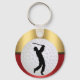 An elegant keychain to hold the keys of a golf enthusiast. The design features the silhouette of a male golfer placed over a large golf ball and set on an elegant ruby and gold background. To edit the design -- resize, replace, reposition or remove any of the design elements -- select "Personalize this template" the select "Edit using Design Tool." A similar design is also available for the female gender on this Zazzle store.