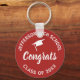 Cadena de claves de graduación con una tapa de grado blanco, la palabra felicitaciones rodeadas por el nombre de tu personalizado de secundaria y clase del año. El regalo conmemorativo perfecto para celebrar al nuevo graduado o una clase completa de graduación. El fondo actual es rojo, pero cambia fácilmente para coincidir con los colores de la escuela.