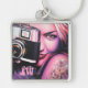 Un graffiti moderno de arte urbano de una mujer con un tatuaje rosa bonito sujetando una cámara. Hermoso arte callejero en su mejor momento, y ahora puedes llevarlo contigo a donde vayas con esta cadena de claves. Añada su monograma y hágalo exclusivamente suyo.