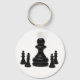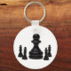 Gran peón negro de ajedrez rodeado por cuatro pequeños reyes de ajedrez aislados en un fondo blanco. Tomando grandeza para la grandeza.