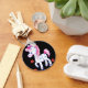 Un caballo blanco con puntos azules y un mané rosado baila con felicidad y una gran sonrisa en su linda cara.