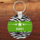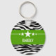 Moderno y moderno Sassy Star Zebra Keychain con un fondo de moda de cebra en blanco y negro y un audaz borde verde de cuadros adornado con un divertido motivo estrella. Este diseño ondulado puede ser personalizado con el texto personalizado de su elección. Haga clic en "Personalizar" para encontrar más opciones de personalización.