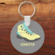 Este llavero presenta el ilustracion de una bota de senderismo en amarillo pálido y azul acuático sobre un fondo gris y está listo para ser personalizado con un nombre debajo con letras amarillas a juego.