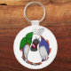 Un Cockatoo personalizado del paraguas tiene los ojos cerrados, un pico abierto y sólo se puede imaginar el volumen de los gritos que salen. Funny Umbrella Cockatoo keychain que otros dueños de loro apreciarán. Fondo azul con palmera verde. Nombre de la especie impreso en la parte inferior izquierda.
