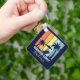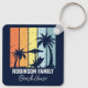 Keychain personalizado de la casa de playa azul marino para tu hogar familiar en Hawaii, Florida u otros destinos de islas tropicales. Las palmeras de Guay se oponen a los colores retro de naranja y amarillo por encima de tu nombre de vacaciones personalizado en escritura blanca. Ideal para un grupo que va en un crucero o una escapada costera.