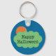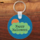 ¡Feliz Halloween! Este ilustracion retro de estilo vintage de Halloween presenta una nube verde brillante con las palabras "Feliz Halloween" entre brillantes estrellas amarillas con una vibrante luna naranja mirando desde atrás.