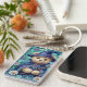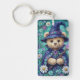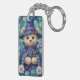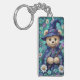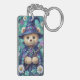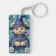 Este caprichoso llavero presenta un pequeño oso, tierno como un hechizo a la hora de acostarse, sentado en el corazón de un prado hecho de medianoche y floración. De ojos redondos y suave, lleva un sombrero y capa de mago de un azul profundo, ambos esparcidos con estrellas y enjoyados con luz violeta, como si el cielo mismo hubiera sido cosido en tela. Un colgante de cristal descansa en su pecho, brillando suavemente como un rayo de luna capturado. Alrededor de él, las flores se agrupan en un círculo brillante y respirante: pétalos blancos, pétalos púrpuras, corazones amarillos, cada flor pintada con el susurro de la lluvia primaveral y la alegría de la mañana. El pelaje del oso es de un cálido color miel y crema, lo suficientemente suave como para sentirlo solo con los ojos, una lámpara silenciosa en el resplandor fresco del jardín. En una pata diminuta, una varita de cristal atrapa la luz, un pequeño fragmento de