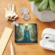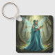 Una hermosa hada con un traje de color turquesa y un collar de piedras turquesas con turquesa y holly en su largo cabello turquesa y sus alas de libélula iridiscente sosteniendo una rama holly en un mágico bosque rodeado de hierba, rocas y árboles cubiertos de viñas.