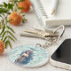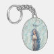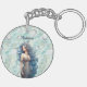 Una hermosa sirena con el largo cabello azul sobre un fondo de verde azulado con un patrón de concha y frontis.