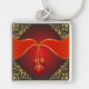 Hermosa cadena de llaves con bolas de Navidad atadas con cintas doradas en un fondo rojo con bordes ornamentales. regalo perfecto para tus amigos y familiares.